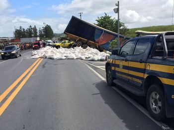 Segundo informações da Polícia Rodoviária Federal (PRF), o acidente ocorreu no quilômetro 61 da rodovia. A carreta colidiu e rodou na pista. Com a força do impacto, o veículo ficou dependurado na mureta de contenção da via.O carro de passeio, um Palio Weekend cinza, teve parte de sua lateral destruída. Ninguém ficou ferido. Por conta do acidente o trecho foi interditado para que houvesse a retirada da carga da pista.